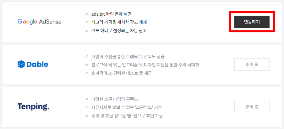 블로그 관리에서 수익 메뉴 - Google AdSense를 확인 후 연동하기 버튼을 클릭합니다.
