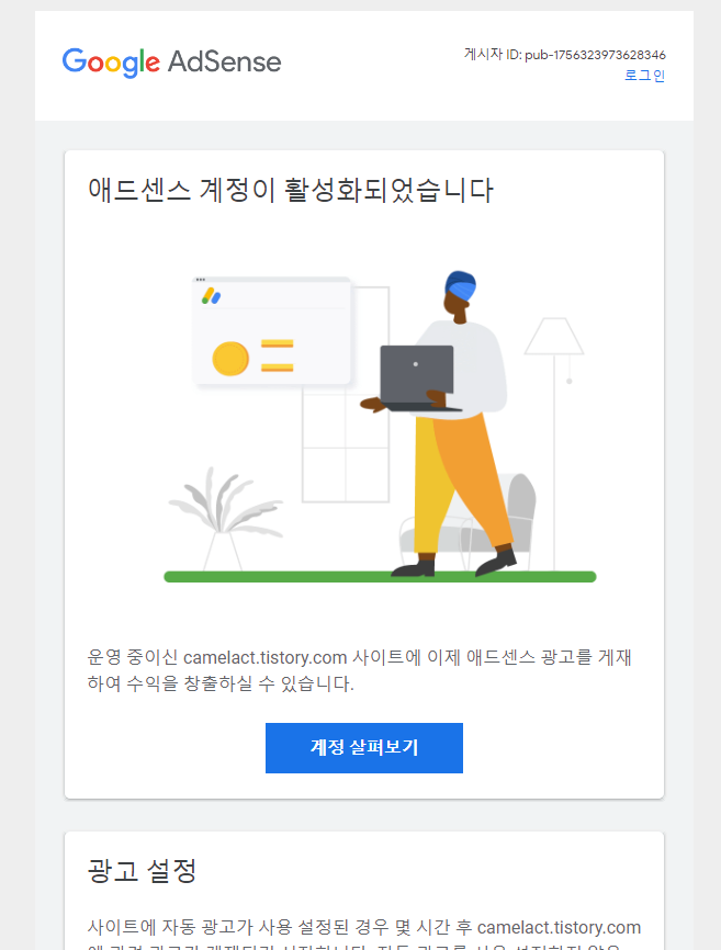 에드센스 고시를 통과하게되면 위와 같이 메일로 활성화 되었음 알 수 있습니다.